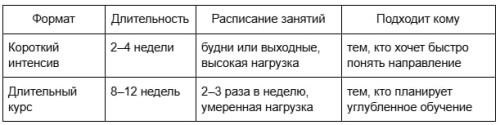 Чего не ждать на старте? Формат обучения и расписание: короткий интенсив или долгий курсКогда интенсив — плюс, а длинный курс — перегруз? Всё зависит от занятости и бюджета.
